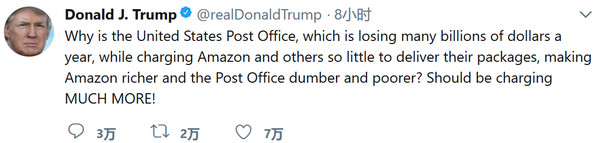特朗普在推特上表示,美国邮政(USPS)应该向邮寄包裹收取更高的费用。“为什么每年亏损数十亿美元的美国邮政,要向亚马逊和其它公司收取这么低廉的费用邮寄包裹,让亚马逊变得富有而邮政变得愚蠢和贫穷?”