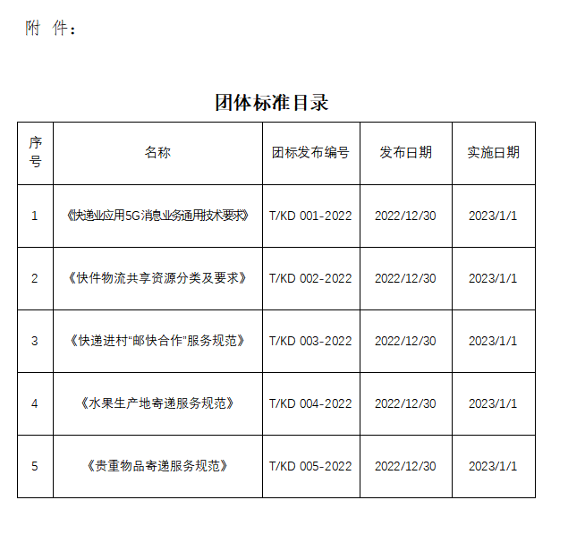 根据《中国快递协会团体标准管理办法》的相关要求,《快递业应用5G消息业务通用技术要求》《快件物流共享资源分类及要求》《快递进村“邮快合作”服务规范》《水果生产地寄递服务规范》《贵重物品寄递服务规范》等五项团体标准按照规定程序编制,经常务理事会审议通过,现予以正式发布,自2023年1月1日起施行。