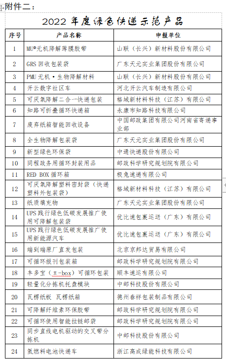 根据《中国快递协会关于开展绿色快递示范案例征集活动的通知》(中快协〔2022〕11号)安排,经过公开征集、网络公示和投票、专家审定等环节,中国邮政集团有限公司湖南省永州市寄递事业部申报的冷水滩区分公司零陵中路绿色网点等26个站点入选为2022年度绿色快递示范站点;山联(长兴)新材料股份有限公司申报的MU?无机降解薄膜胶带等26个产品入选为2022年度绿色快递示范产品;联邦快递(中国)有限公司申报的北京顺义操作设施屋顶光伏发电项目等22个项目入选为2022年度绿色快递示范项目。(具体征集结果见附件)