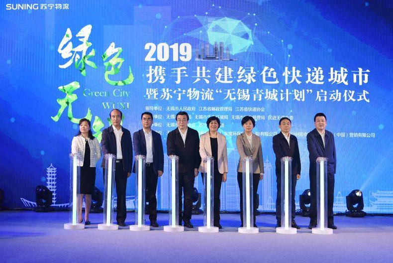 江苏省邮政管理局、无锡市政府、无锡市人大、江苏省快递协会、苏宁物流、无锡市邮政管理局、无锡市公安局、无锡市生态环境局和无锡市快递协会领导共同按下了启动按钮,标志着绿色快递城市项目在全省正式启动。