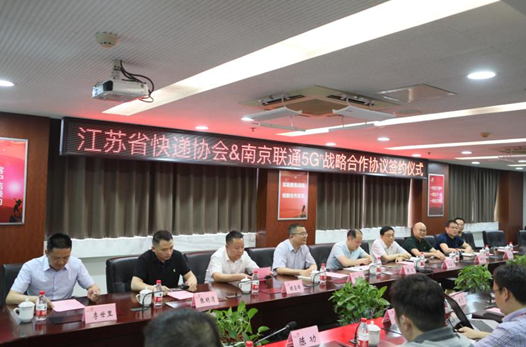 2019年6月11日下午,江苏省快递协会与江苏南京联通签署5G+智慧快递战略合作协议。江苏省邮政管理局蒋波副局长、省快递协会孙安宁会长、江苏南京联通顾建明总经理以及顺丰、中通、申通、圆通、韵达等五家省级快递企业总经理出席并见证了协议的签署。