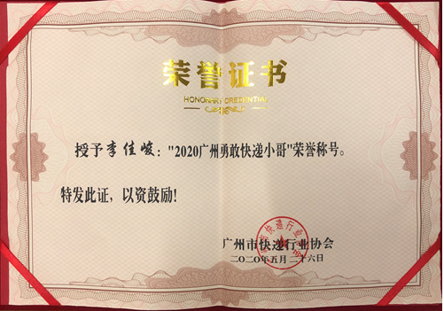 李佳峻同志的见义勇为行为向社会传递了正能量,温暖了万千群众,同时也体现了快递小哥的“勇于担当”。为了弘扬见义勇为的精神,市快递行业协会授予李佳峻同志“2020广州勇敢快递小哥”荣誉称号,并于5月27日上午向其颁发了荣誉证书和奖励金。