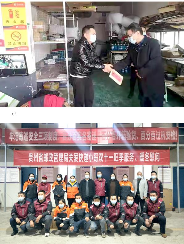 贵州省邮政管理局、贵州省快递协会对慰问的邮政、快递奋战在“双11”生产一线的员工带去了慰问金、口罩、消毒液、手套及具有民族特色的酸汤粉。