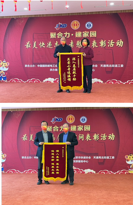 北京市快递协会代表快递行业和快递小哥分别向中国国防邮电工会、市总工会服务工会、天通苑北街道赠送了锦旗,感谢他们一贯以来对协会工作的支持和帮助,以及对快递行业的关心关爱,让快递小哥们享受到免费体检、冬送温暖夏送清凉等各项贴心服务。关心关爱新业态新就业群体,促进快递行业融入社区管理体系,实现相互融合,共同发展。为了感谢协会对地方政府的工作支持,天通苑北街道向北京市快递协会回赠了锦旗。