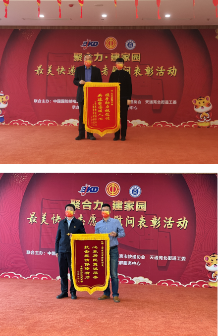 仪式上,刘迎祥主席代表中国国防邮电工会向顺丰快递员金亮等15名快递小哥每人颁发了1000元慰问金。北京市总工会服务工会孙宇主席、昌平区总工会王冰主席、天通苑北街道工委李刚书记和北京市快递协会领导一起向快递小哥颁发了“最美快递志愿者’荣誉证书”和慰问品,以表彰他们在天通苑疫情期间化身志愿者坚守工作岗位,为打赢抗疫之战所作出的突出贡献。京东配送员彭东方作为15名荣获“最美快递志愿者’的快递小哥表示,感谢工会领导、快递协会和天北街道领导对我们的关心关爱,疫情爆发初期我们都很紧张,快递协会主动联系我们解决困难,协会领导不仅到现场给我们送来了水壶、防寒衣物等物品,还专门为我们这些小哥谱写了《快递之歌》,鼓舞了士气,振奋了人心。天北街道组织我们滞留小区内的15名快递员成为小区疫情防控志愿者,千方百计帮我们协调解决了住宿和吃饭问题,虽然当时每个人每天配送米、面、油、水、蔬菜等生活必需品的重量要超过1000斤,很累很辛苦,但每当看到居民感激的笑脸,就觉得我们所有的付出都值了。今后再遇到此类情况依然会迎难而上,决不辜负领导的期望。为感谢疫情防控期间对小哥的呵护与照顾,顺丰和京东两家企业代表志愿者团队分别向北京市快递协会和天北街道赠送了锦旗表示感谢。