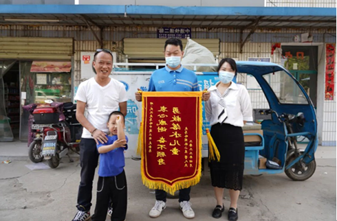 4月9日,管先生夫妻俩专程带着孩子,来到皮金志所在的中通武汉走马岭网点走马岭二部,为他们送上锦旗,也让孩子记住了这位救了他性命的快递叔叔。
