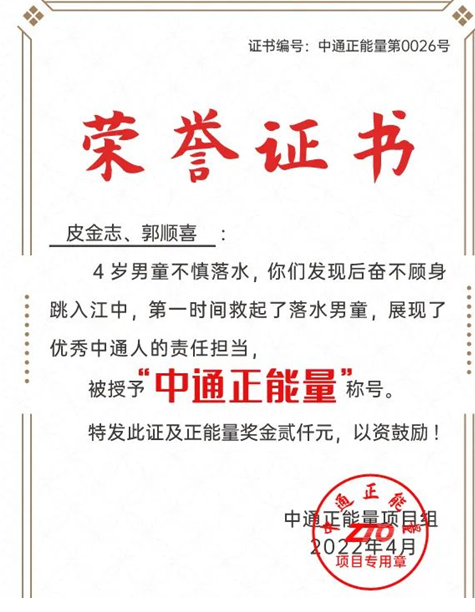 湖北省管理中心得知情况后,当即表态表彰皮金志二人英勇救人的行为,湖北省管理中心总经理金香为他们颁发“湖北中通见义勇为先进个人”荣誉证书,并奖励4000元现金,而中通快递集团总部也决定授予二人“中通正能量”荣誉称号,并奖励正能量奖金2000元。