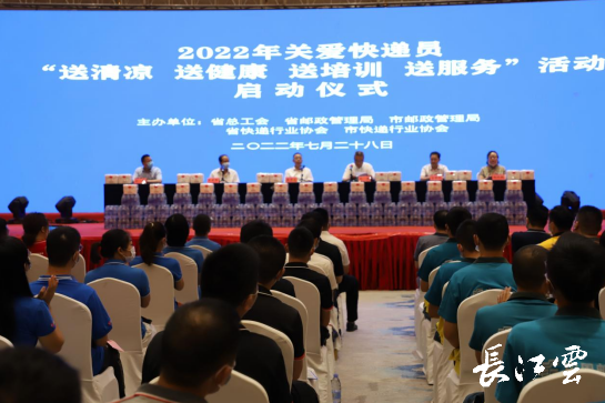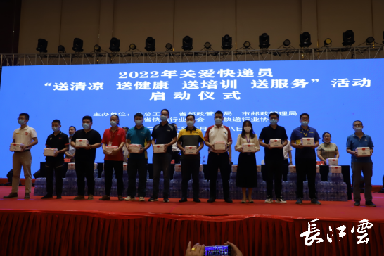 7月28日,关爱快递员“送清凉、送健康、送培训、送服务”活动启动仪式在武汉召开,本次活动由湖北省总工会、湖北省邮政管理局、武汉市邮政管理局、湖北省快递行业协会、武汉市快递行业协会联合举办,邮政、顺丰、三通一达、极兔等12家主要快递企业和快递上下游相关企业参与,主要内容是向快递企业代表赠送健康卡、清凉物资、高温预防救治培训与服务产品展示与交流。