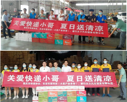 近日重庆连续高温,气温高达45℃左右。为做好防暑降温工作,在常态化疫情防控形势下切实维护高温期间快递员的劳动权益,2022年8月23日,重庆市快递协会联合长安车联科技(大客户业务部)、睿行天下汽车销售有限公司对重庆优迅快递公司、重庆市恒韵通物流有限公司开展“关爱快递小哥、夏日送清凉”慰问活动。此前,8月18日,重庆市快递协会参与团市委、市青联、市邮政管理局联合开展的“喜迎二十大、酷暑送清凉”慰问活动,深入京东、顺丰等品牌营业网点,为快递小哥送上“清凉”礼包。