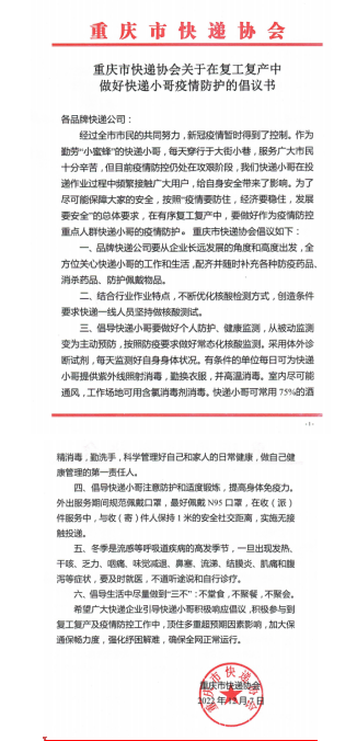 重庆市快递协会向品牌快递企业发出倡议:在复工复产中做好快递小哥疫情防护
