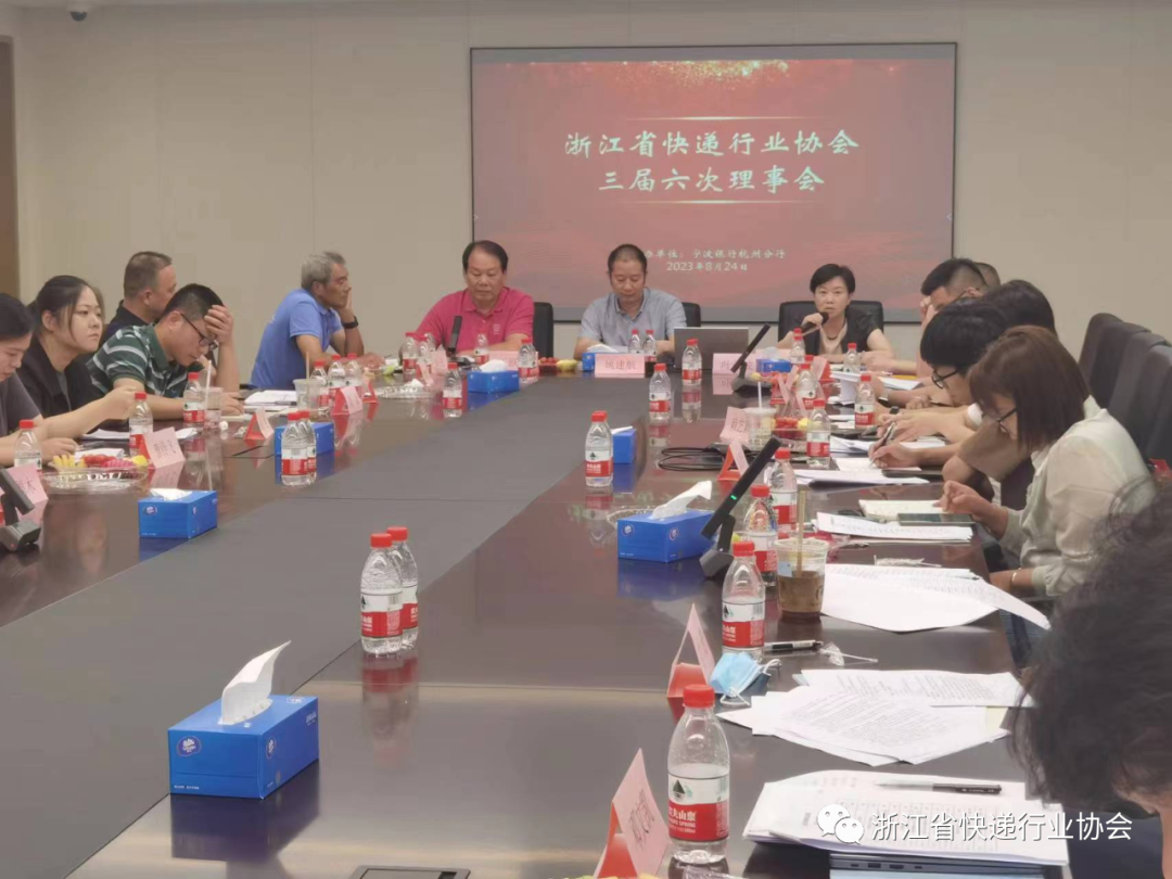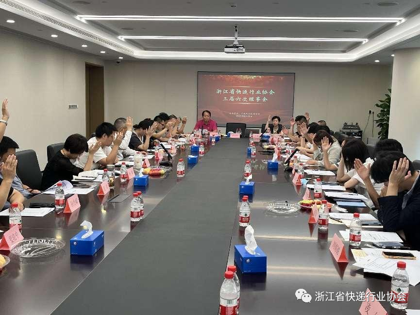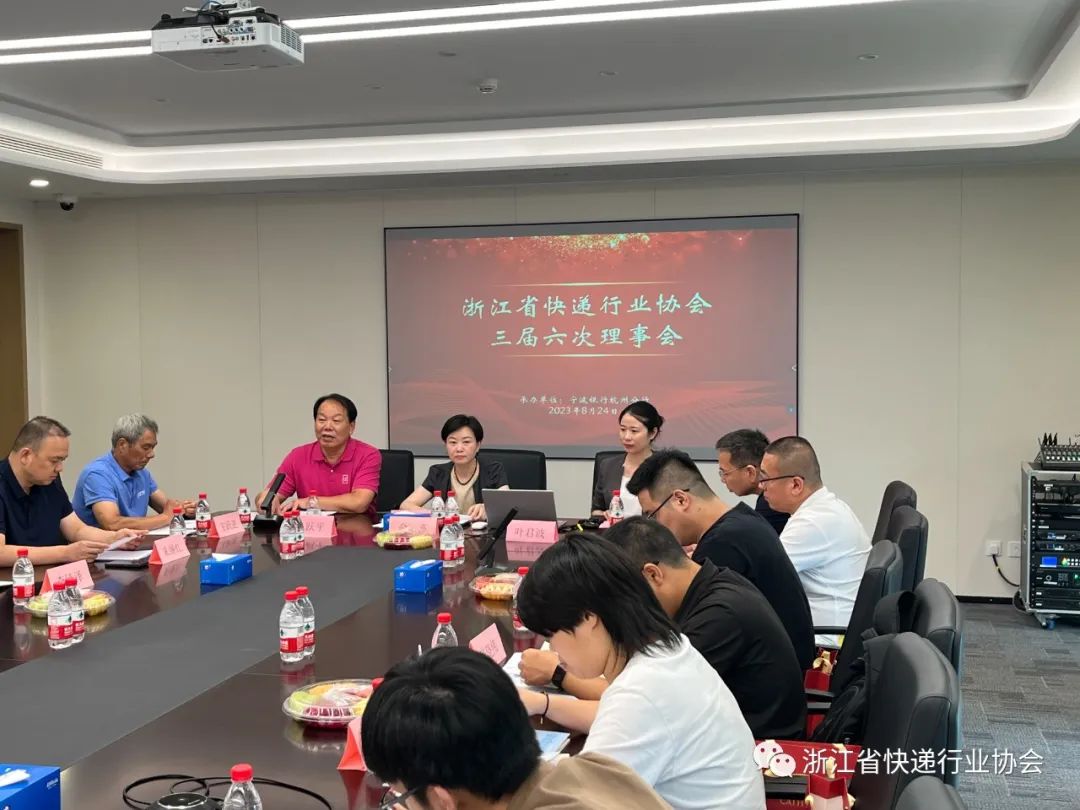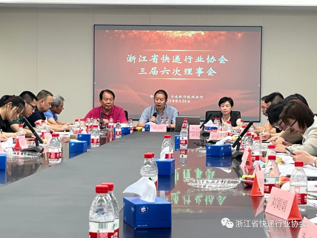 2023年08月28日来源:浙江省快递行业协会2023年8月24日,浙江省快递行业协会第三届六次理事会在宁波银行杭州分行胜利召开。会议由王跃平秘书长主持,省邮政管理局二级巡视员姚建航、协会理事长、副理事长及部分理事单位代表出席,宁波银行杭州市分行营业部副总经理叶君波列席并致欢迎辞。
