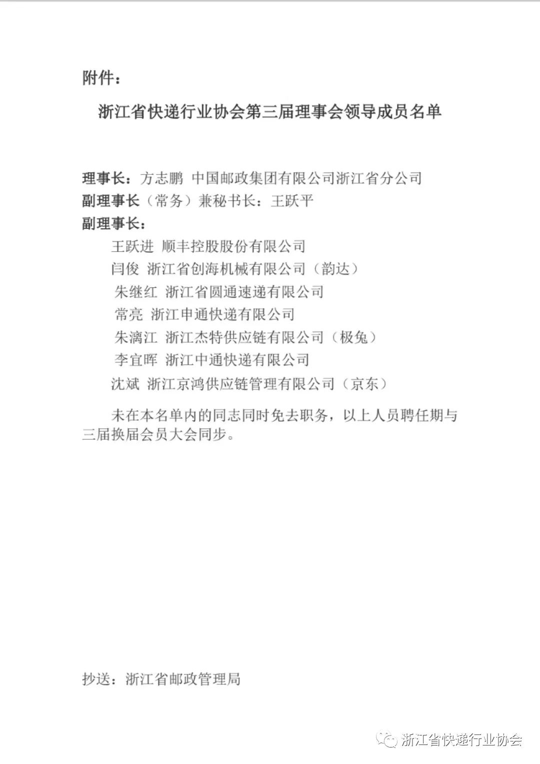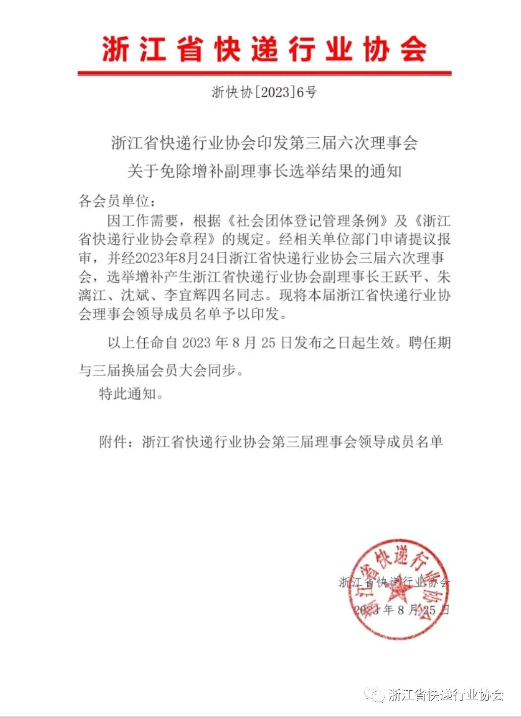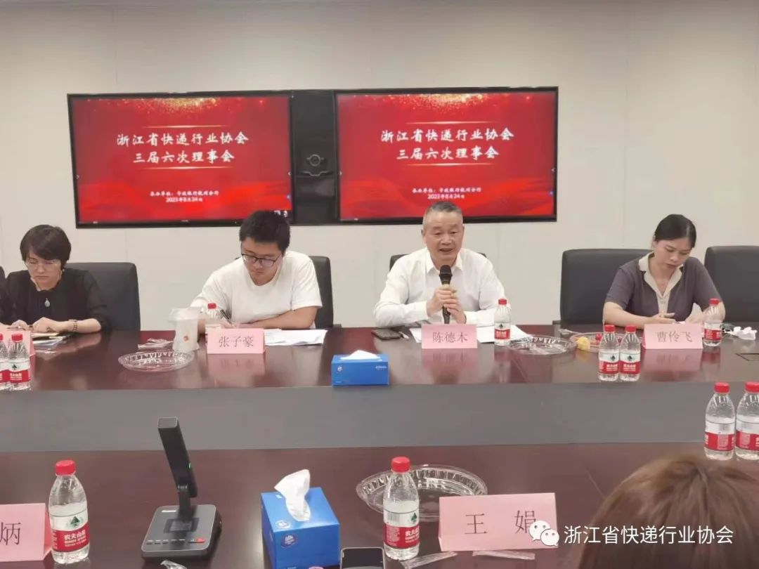 2023年08月28日来源:浙江省快递行业协会2023年8月24日,浙江省快递行业协会第三届六次理事会在宁波银行杭州分行胜利召开。会议由王跃平秘书长主持,省邮政管理局二级巡视员姚建航、协会理事长、副理事长及部分理事单位代表出席,宁波银行杭州市分行营业部副总经理叶君波列席并致欢迎辞。