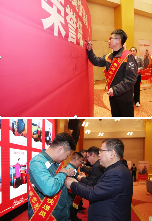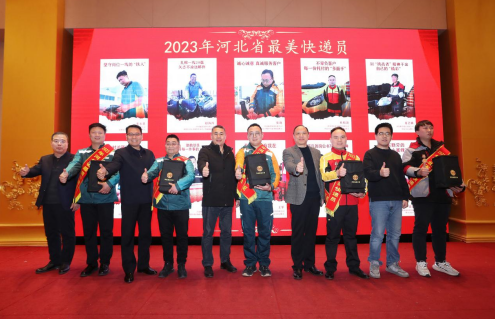 1月23日,2023年“河北省最美快递员”宣传发布仪式在石家庄隆重召开。发布仪式上,荣获2023年“河北省最美快递员”称号的张永基、王超、李兵等10位一线优秀快递员身披红色荣誉授带,走过红毯,在荣誉墙上庄严签名,由出席颁奖的相关部门领导为获奖者佩戴荣誉奖章、送上奖品。
