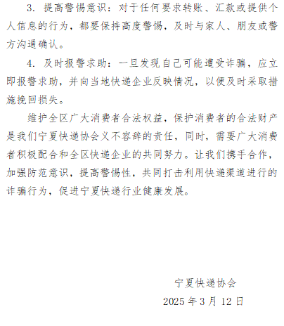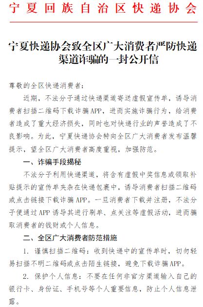 宁夏快递协会发布公开信,全力守护消费者权益,严防快递渠道诈骗