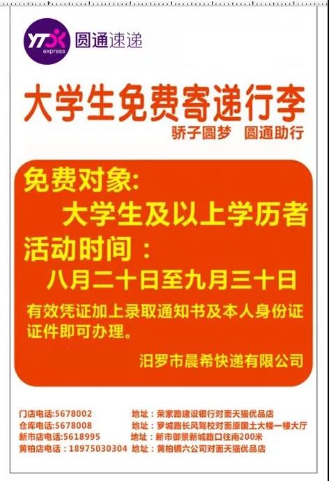 大学新生只要在今年9月30日之前,持本人身份证、录取通知书或学生证在汨罗公司4个指定站点即可免费邮寄生活物品,不限次数和重量;但寄递品不能有违禁品,收货地址只能是就读学校地址。同时,公司还免费为汨罗籍建档立卡贫困户邮寄物品。