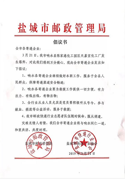 一方有难,八方支援。3月22日,盐城市邮政管理局和盐城市快递行业协会向当地发出倡议书,号召寄递保障寄递渠道安全畅通,积极参与救援工作。