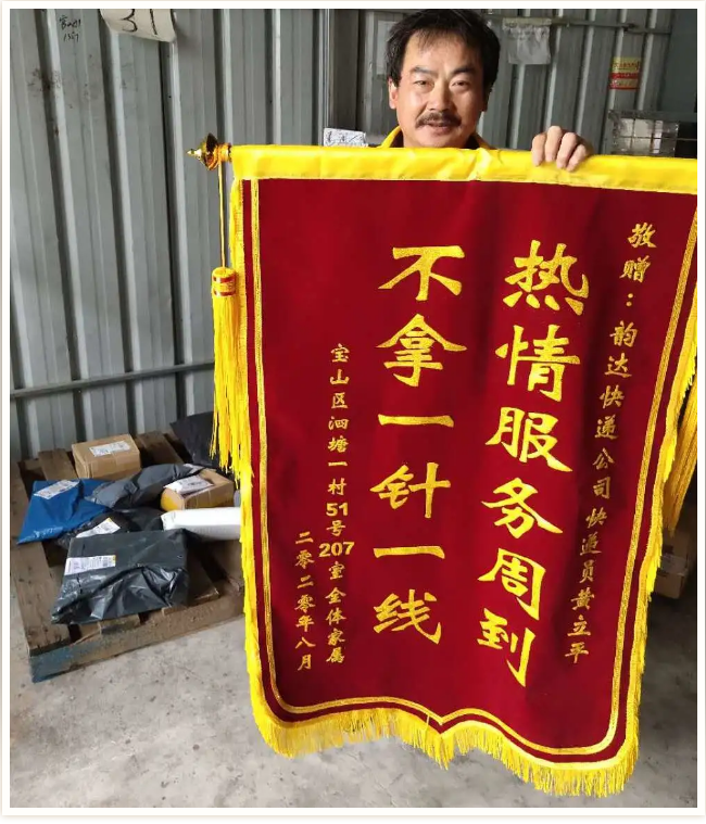 韵达小哥获赠“热情服务周到,不拿一针一线”锦旗