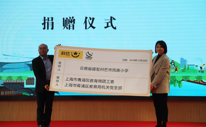 12月28日,2020年上海市青浦区教育系统圆梦“1+1”爱心公益活动在青浦区清河湾中学举行,在活动现场,为感谢韵达对圆梦“1+1”活动的支持和帮助,上海市青浦区教育局向韵达赠予了一封特制感谢信。
