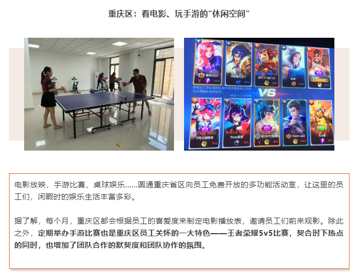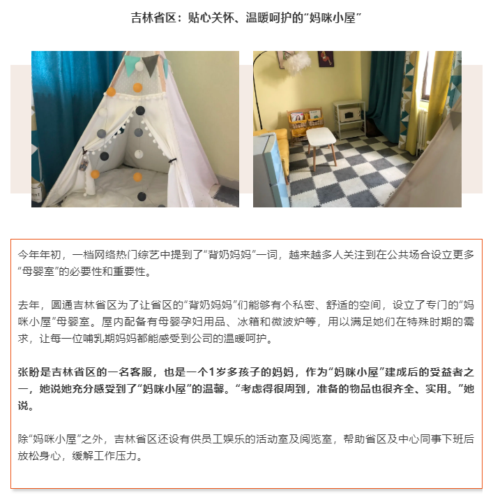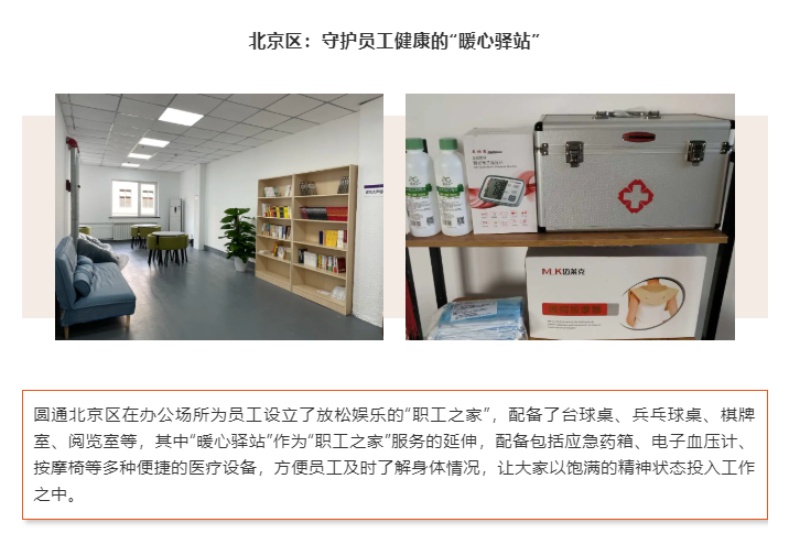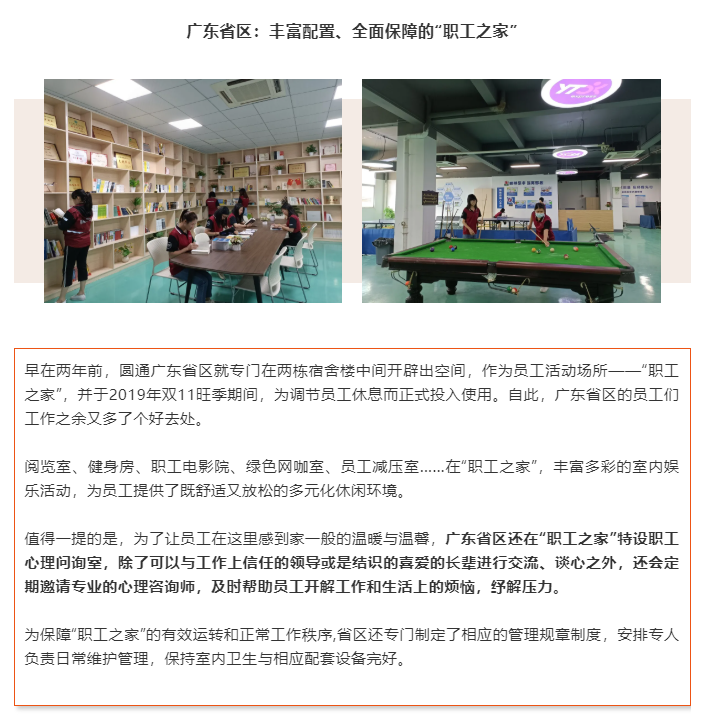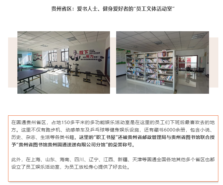 人是企业最宝贵的资源。如今,在圆通总部及全国各地省区,上百平米的员工活动室、贴心人性化的母婴室、藏书千余本的职工阅览室、配备齐全的健身娱乐室,一应俱全,面面俱到……圆通始终坚持以人为本,持续创新、丰富形式,关心、关怀快递小哥等在内的快递一线员工。