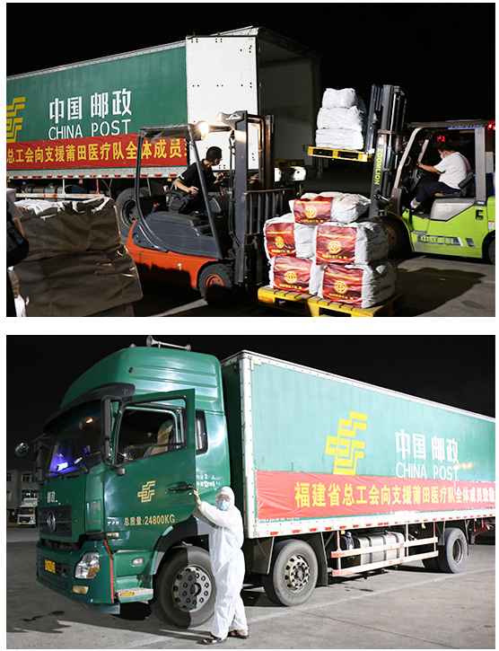 近日,福建省邮政分公司承运省总工会为抗疫一线人员筹集的3500组躺椅、凉席、夏薄被等物资,目的地为莆田仙游。