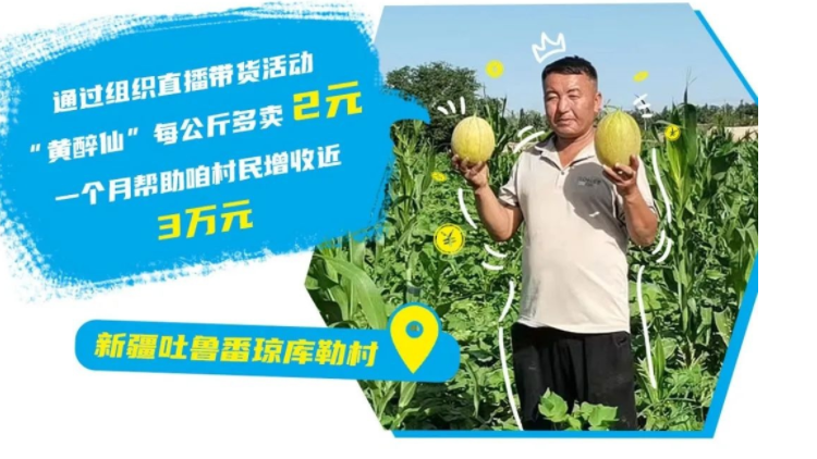 其中,6月1日,在新疆吐鲁番艾丁湖镇的琼库勒村,一场两小时的直播帮助当地瓜农销售“黄醉仙”甜瓜4800斤。据悉,直播当日,本地售瓜网红在抖音、快手、淘宝等多个平台直播销售。客户下单后,赵丽梅带着网点快递员组织瓜农采摘、打包并装车、发货,售往全国各地。